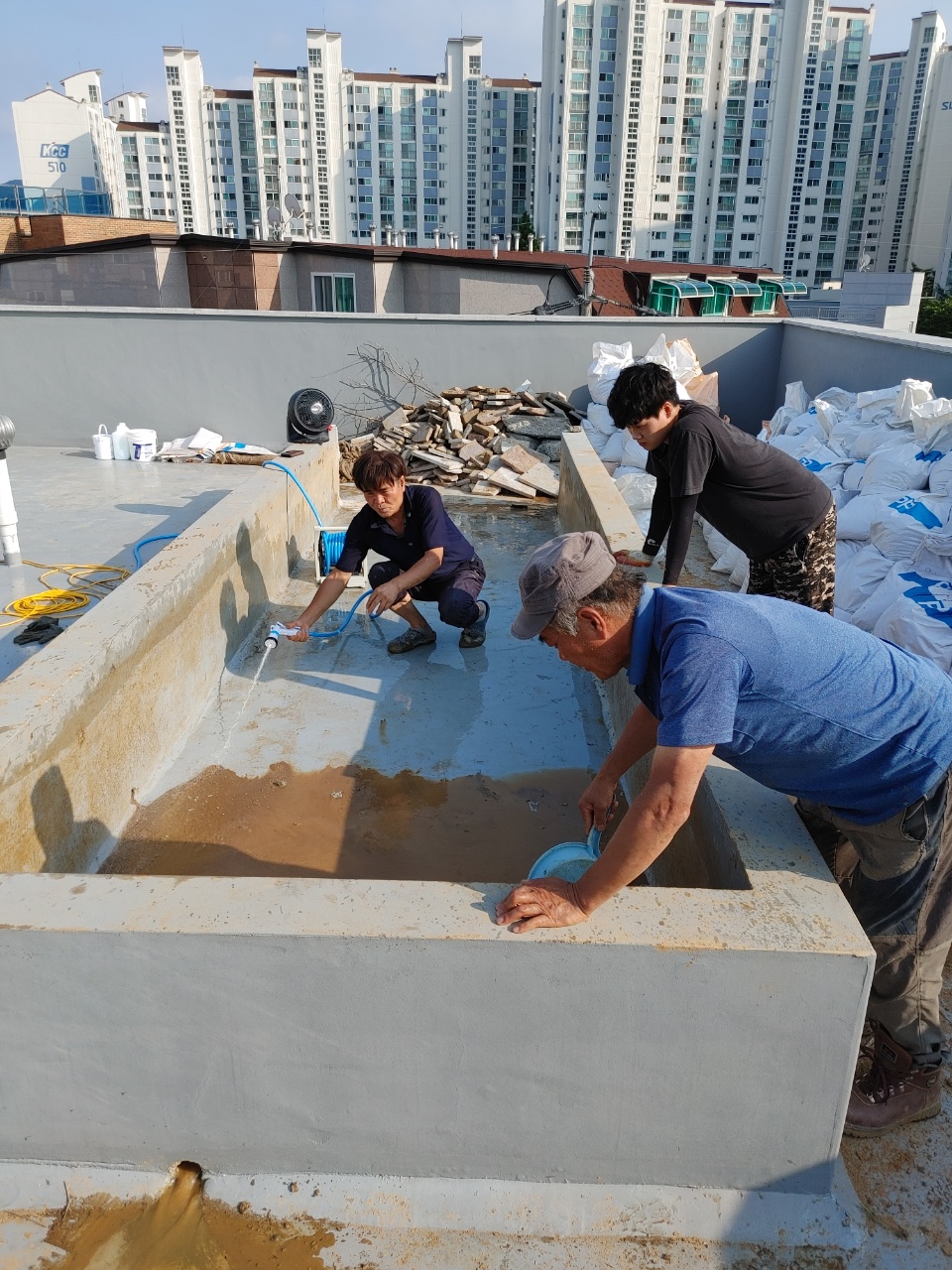 해소누수탐지공사에서는 옥상 전체를 꼼꼼하게 점검하고, 기존의 화단을 철거한 후, 바닥을 평탄하게 만들고 배수 시설을 정비했습니다. 그리고 방수 공사를 세 단계에 걸쳐 꼼꼼하게 진행하여 완벽하게 누수를 막았습니다.