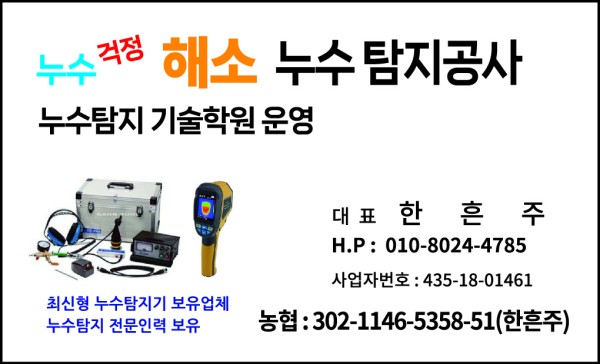 수많은 시공사례로 입증된 신뢰의 파트너, 해소 누수탐지안녕하세요! 누수 문제로 걱정이신가요? 누수는 가정이나 상업 공간에..